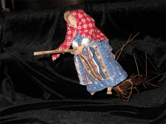 Broom Hilda is a Kitchen Witch. You will find Kitchen Witches in may Scandinavian kitchens. If you hang Broom Hilda in your kitchen, she will bring good fortune to your home. She's a lucky little kitchen witch who knows a special gnome. You'll not have another burnt pot, and she is sure to keep your meals hot. She will help you with every kitchen chore, if only you will hang her in your kitchen door.