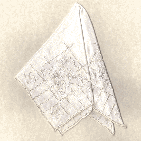 HKY - 12 - A beautiful vintage lady's hanky! Incredible needlework! This handkerchief would be perfect for a wedding hanky on the brides special day! The delicate leaves are surrounded by exquisitely embroidered flowers and ribbons The pattern is repeated in each of the four corners. The fine white linen background is embellished with the most skillful needlework that is undoubtedly from Art Deco 1910-1930's era. A perfect representation of the delicate hand embroidery that the Deco period is known for. The hanky measures approximately 11" square. $28.00