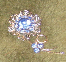 BR - 97 - Stunning vintage silvertone layered floral brooch, set with the most AMAZING Bermuda Blue rhinestones! There is one huge prong-set stone in the center of the flower that is set atopf of a filigreed bottom layer, with 12 beautiful matching stones encircling the large center stone. There are three more prong set stones on the stem. This is a remarkable brooch, measuring approx. 21/2" long by 1" wide. Excellent condition, with no flaws or finish wear. $65.00 + $5.00 s/h within United States & sales tax