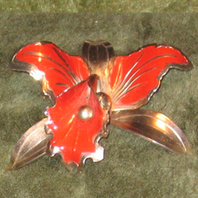 - BR - 18 - '40's vintage brushed gold tone individually petaled Orchid red enameled brooch