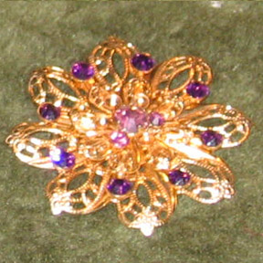 - BR - 36 - Golden brooch with faux amethyst rhinestones.